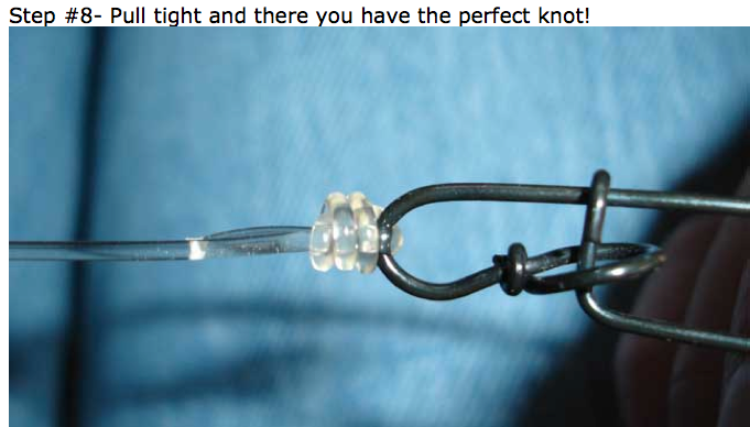 Gäddor har massor med vassa tänder, så för att undvika linbrott vid närkontakt kör vi titan- och fluorcarbontafsar. Mike har snöat in på den lättare fc-varianten. På nätet finns en uppsjö av bättre och bäst-knutar. Här är en jag testade, som troligtvis blir den Adamsson får med sig söderut - om den duger åt herr'n...